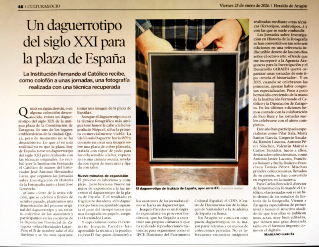 El pasado jueves 25 de enero del presente 2026 se hizo entrega al director de la Institución Fernando el Católico (DPZ), Carlos Forcadell Álvarez, del daguerrotipo realizado por el fotógrafo Joaquín Paredes Piris durante las pasadas VI Jornadas sobre Investigación en Historia de la Fotografía (2025). Se trata de una Vista de la Plaza de España que el fotógrafo extremeño, experto en procesos fotográficos antiguos, tomó durante la mañana del 31 de octubre 2025. De este acontecimiento se ha hecho eco la sección de Cultura & Ocio de Heraldo de Aragón a través de un documentado artículo firmado por el periodista Mariano García.