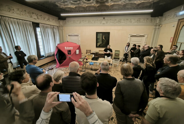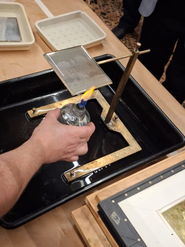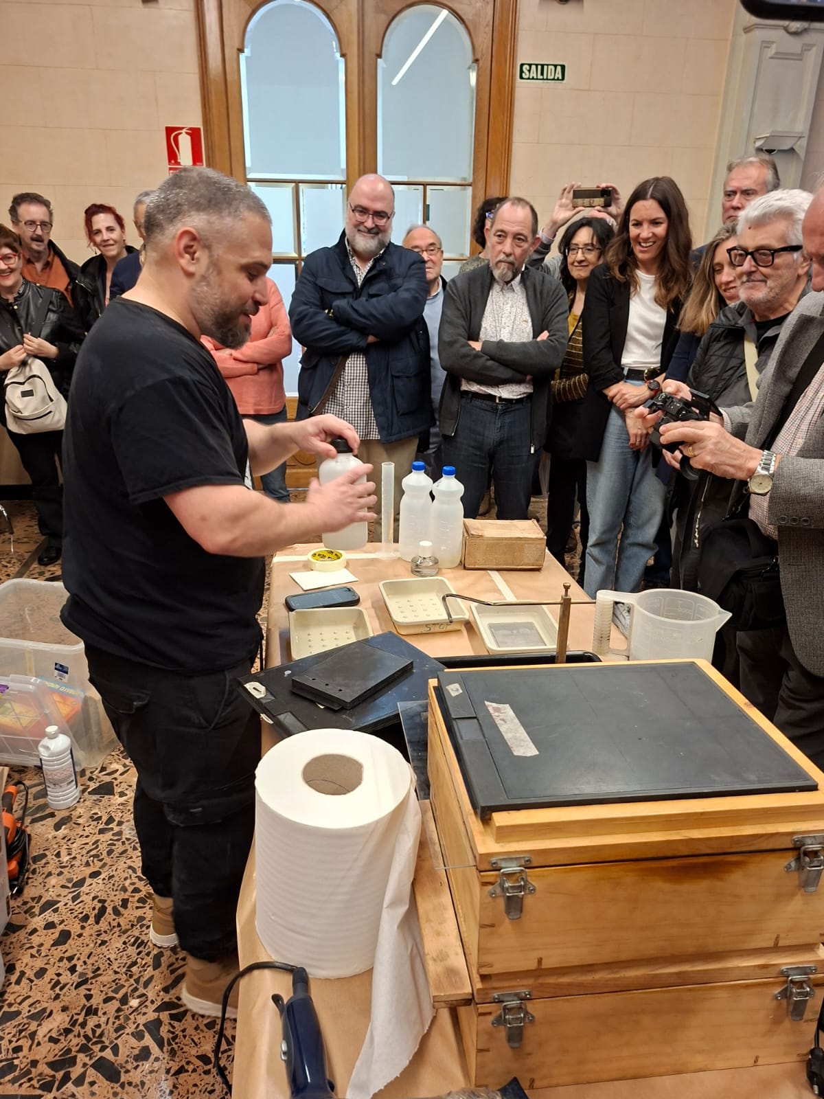 Joaquín Paredes durante la demostración del proceso del daguerrotipo, Aula de la Institución Fernando el Católico, 31 de octubre de 2025.